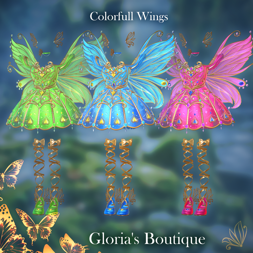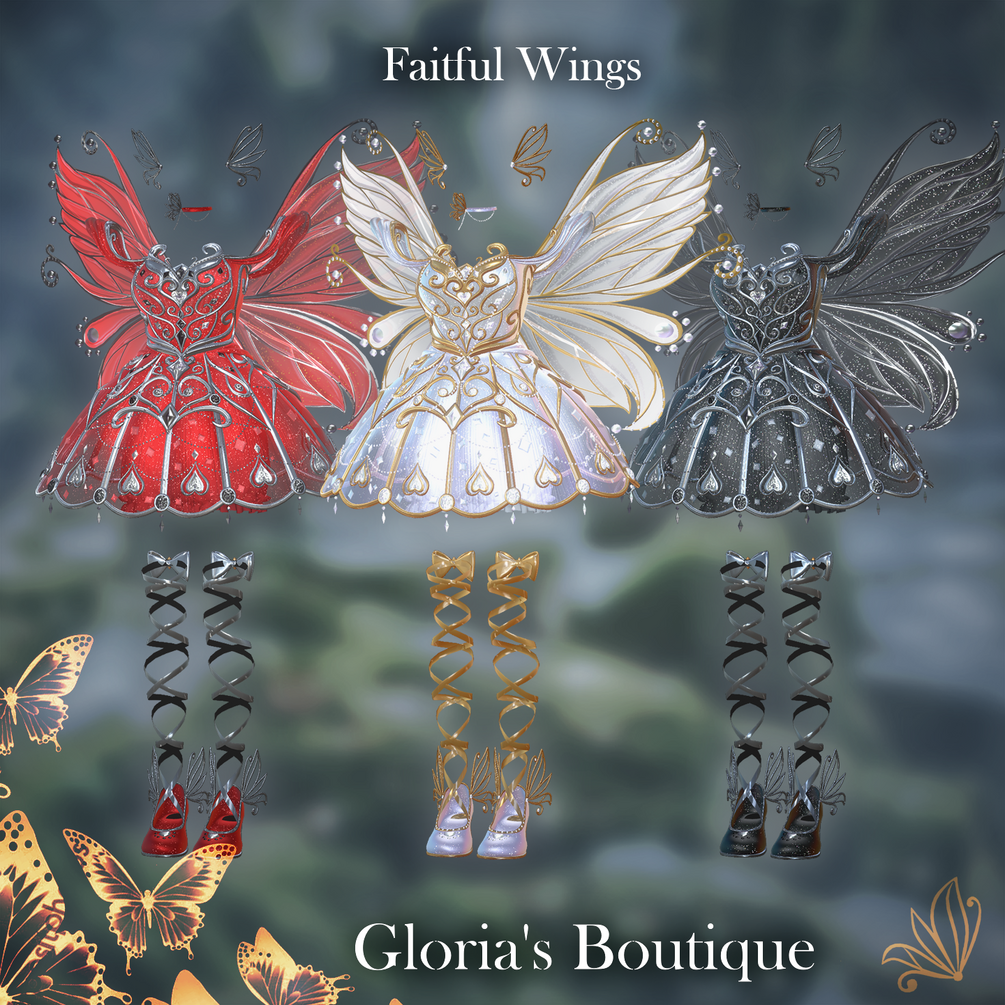 肩の後ろには、柔らかく透明感のある羽のようなパネルがひらひらと舞い、まるで森の守護者や天上の精霊のような優雅なシルエットを描き出します。羽に輝く宝石のアクセントから、魔法の蔓のように脚に巻きつく繊細なリボンサンダルまで、細部までこだわり抜かれています。
