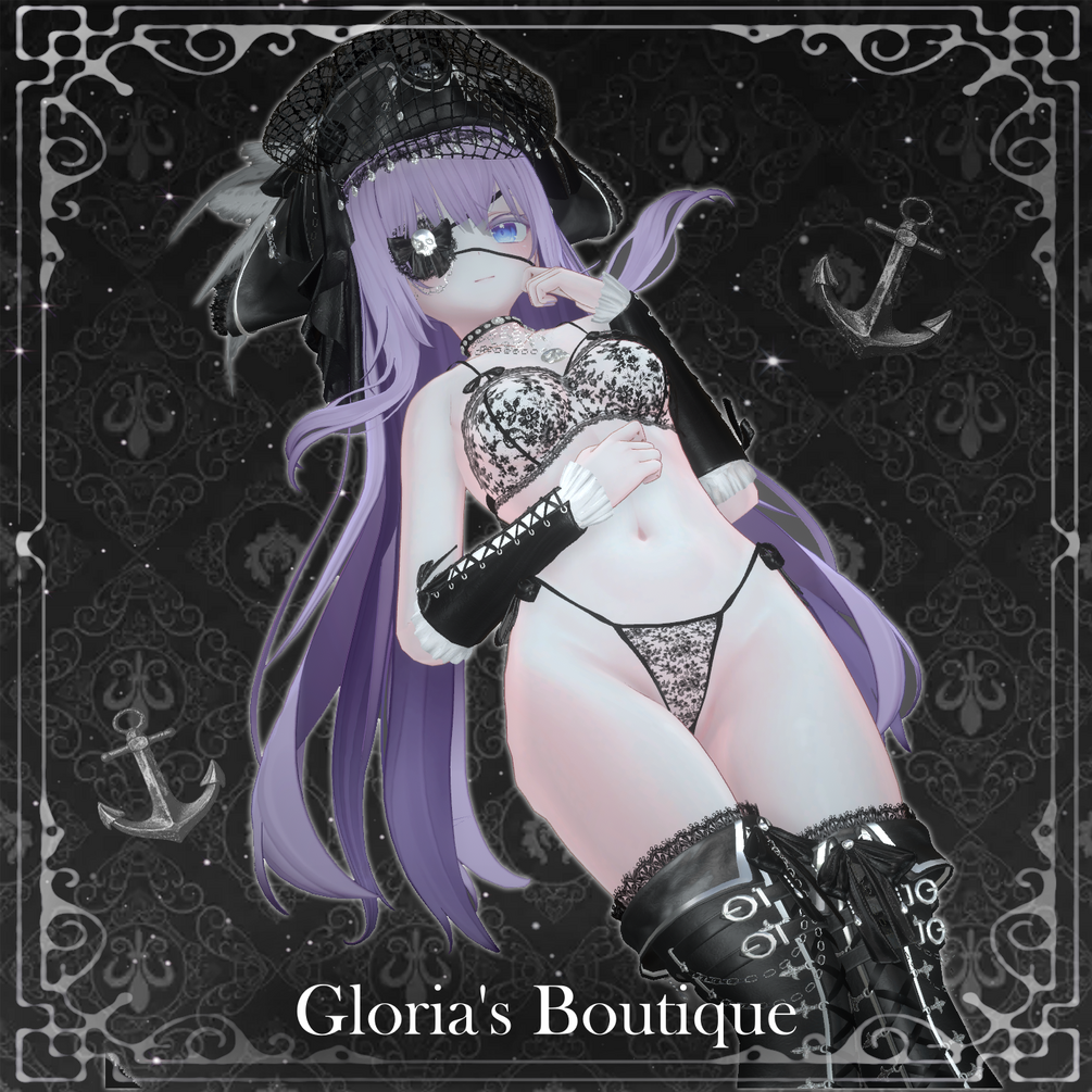 大切にされたスカルペンダントのネックレスが鎖骨の上に優しく輝き、失われた航海とささやかれる伝説を思わせる宝物のよう。ゴシックロマンチックな雰囲気を引き立てるのは、柔らかなグレーシルクのオフショルダーパフスリーブ、金属スタッズがあしらわれたメッシュのフィンガーレスグローブ、そして大胆なブラックアイパッチ。彼女の反逆的な魅力を完璧に仕上げます。