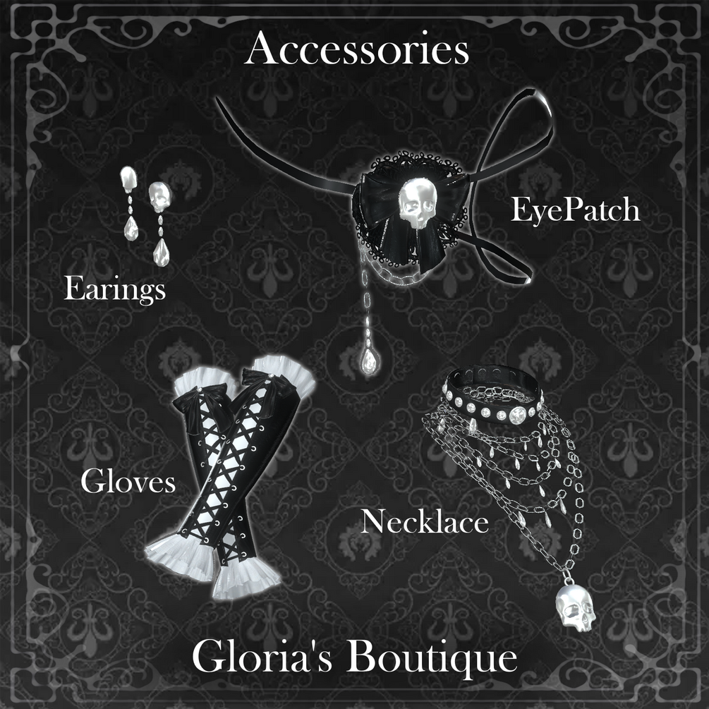 사랑스럽게 간직된 해골 펜던트 목걸이는 그녀의 쇄골 위에 섬세하게 놓여 있으며, 잊힌 항해와 속삭이는 전설의 상징 같은 존재입니다. 고딕 로맨틱 무드를 더해주는 부드러운 회색 실크 오프숄더 퍼프 소매, 메탈 스터드 장식의 시스루 핑거리스 장갑, 그리고 대담한 검정 안대는 그녀의 반항적인 매력을 완성시켜줍니다.